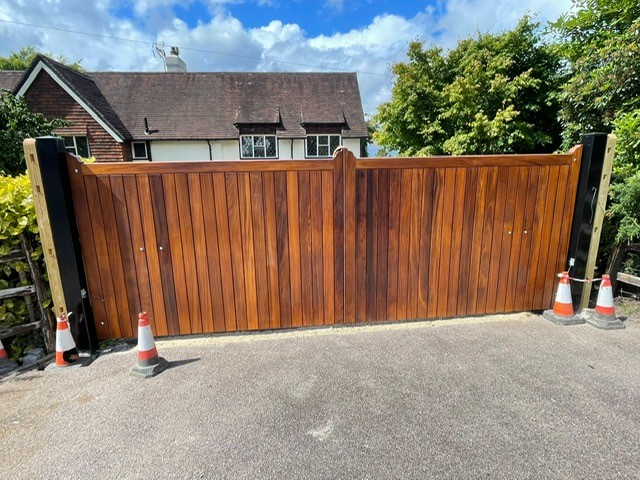 Newly installed Iroko 5-bar gate, automated with NICE ram and controlled via Telguard GSM entryphone
